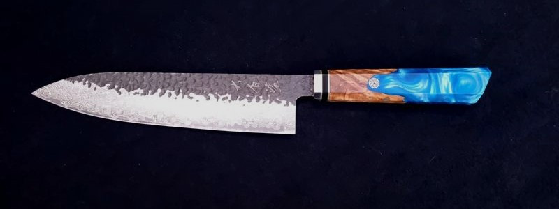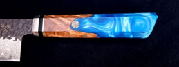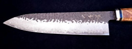 Es liegt sehr gut in der Hand und macht wirklich Freude damit zu arbeiten. Unser Messer wird bei Profiköchen wie auch ambitionierten Hobbyköchen sehr geschätzt. Für Fleisch, Fisch und Gemüse geeignet.Die Klinge ist aus rostfreien Damaszener-Stahl mit 64 Lagen gefertigt. Die innere Lage besteht aus VG10 Stahl. Dieser Stahl ist äusserst korrosionsbeständig, extrem hart (61+/-HRC, 1.0% Kohlenstoff, 1.5%Kobalt) und hält die Klinge, bei entsprechender Pflege, dauerhaft scharf. Das Messer ist sehr gut ausgewogenen und erlaubt ermüdungsfreies Arbeiten.